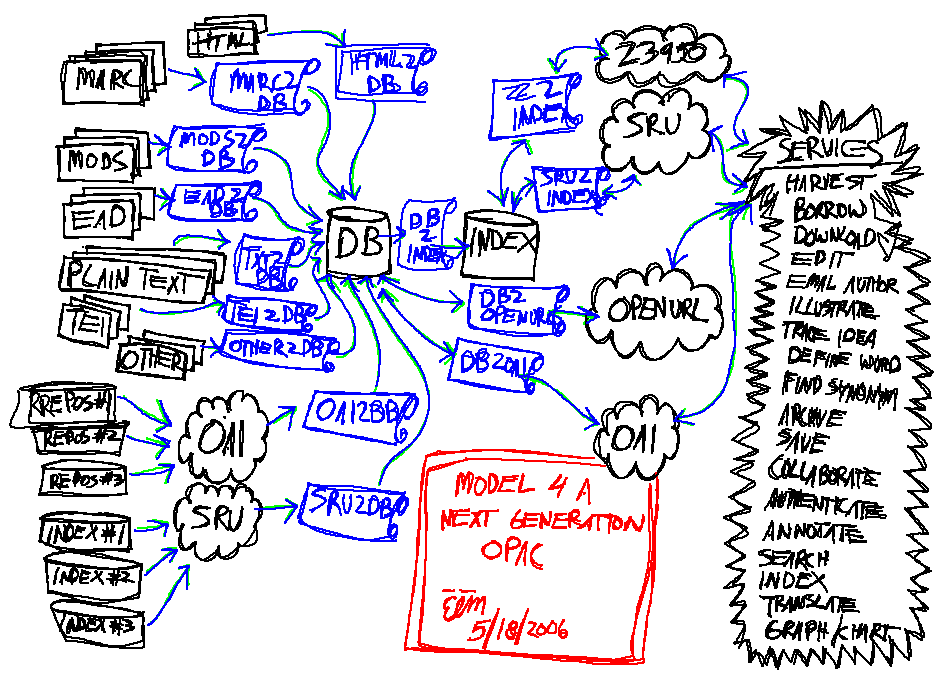 Take another step back and ask yourself about the primary activities of librarianship. Think fundamentally, and I believe we could distill the activities down to roughly four categories, each being no more important than the others: collection, organization, preservation, and dissemination. First, we bring together collections of "stuff". Traditionally, this stuff includes books and journals along with the myriad of other analog materials alluded to above. More recently, we spend more and more time and money bringing licensed content into our "collections" -- stuff we don't own but pay for the privilege of just viewing. With the advent of globally networked computers, why could this content not also be the full text electronic books and journal articles, JPEG images, streaming movies, blog postings, names and addresses of people, mailing list archives, datasets, Powerpoint presentations, etc. whether they be free or licensed?