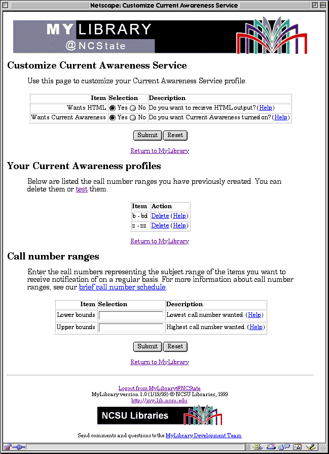 There are at least four things that make MyLibrary@NCSate is more than a portal nor bookmark manager. First, the system includes a service allowing users to regularly receive and search lists of new books added to the library's collection, the Current Awareness service. Using Library of Congress call numbers for books and serials, users can create any number of Current Awareness profiles. The MyLibrary@NCSate system saves these profiles and searches its database for them on a regular basis. Search results are sent to a user's email address, which allows direct access to the library's catalog via a hotlink and to more information describing the book.