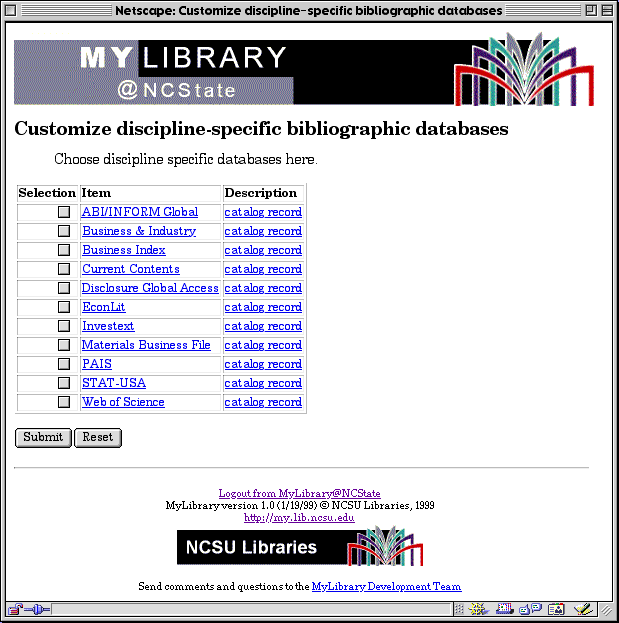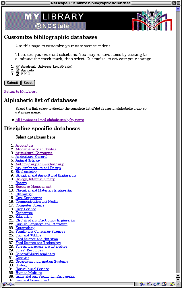 For example, by selecting among the system's many Customize hotlinks, a user is presented with lists of disciplines. Each list is associated with information resources (databases, journals, Internet resources, etc.) specific to that discipline. Resources from any discipline may be chosen to include in the user's MyLibrary@NCState personalized digital library, which appear in the Web browser after the selections are submitted. The next time a user visits MyLibrary@NCState, the system remembers all customizations and lists them accordingly.