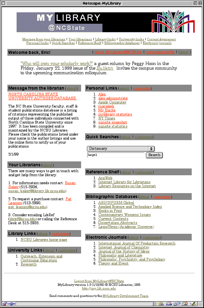 Finally, unlike bookmark managers, MyLibrary@NCState is portable and requires only a Web browser to use. Because access to the system's database is keyed to the university's authentication system, valid users can access MyLibrary@NCState from just about any Web browser in the world. MyLibrary@NCState can be accessed from offices, homes, or even within the library. Conversely, bookmark managers or locally defined sets of bookmarks are bound by a particular machine or computing system.