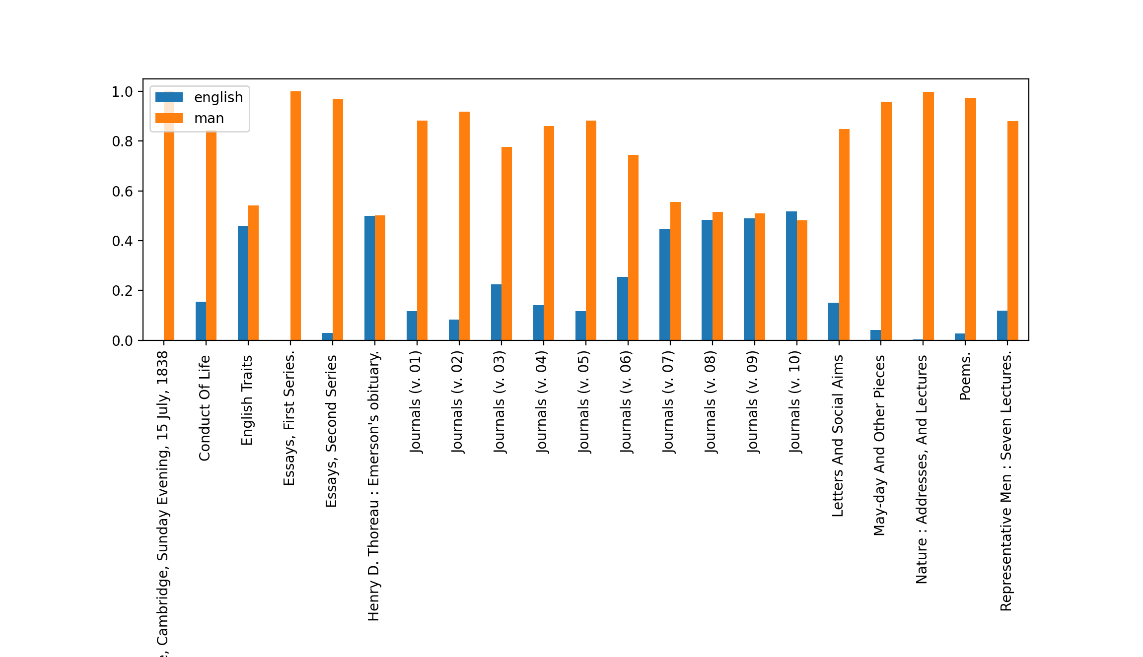 The pie chart illustrates how three-quarters of the texts are about "man" (which is similar to the result of the feature reduction modeling process, and illustrated with the dendrogram), and the bar chart illustrates how many of his journals emphasized "english":